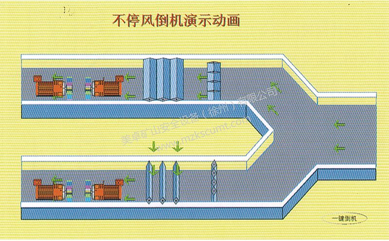 通風機不停風倒機系統通過先進的遠程監測及控制系統,邏輯控制快速開啟或關閉自密式旋葉風門,實現通風機的快速切換,使倒機過程對通風機系統的影響由傳統的“系統停風”縮短為“風量波動”,故障狀態下的倒機時間明顯縮短,將原主扇通風機倒機時間由現在的五至十分鐘縮短到一分鐘之內。整個系統自動化程度高,可實現主扇系統無人值守,故障自動報警,故障自動倒機。