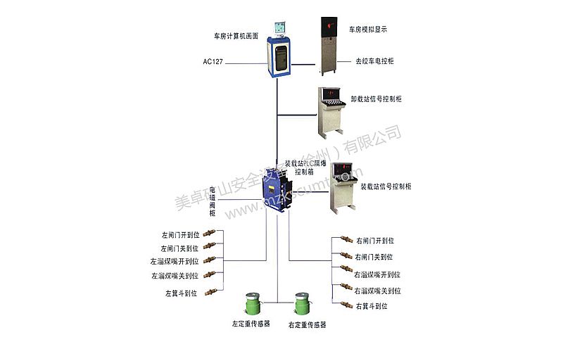 《煤礦安全規程》382條規定“箕斗提升必須采用定重裝載”的規定。主井提升信號及定重裝載系統系統可實現井下定重裝載自動控制,井上數據管理和卸載系統自動控制。系統由稱重傳感器、井上下PLC可編程控制箱、裝載液壓站、井上下操作臺及絞車房狀態顯示箱等組成。